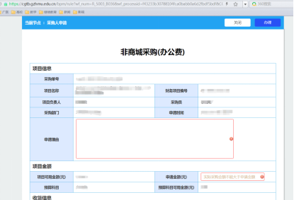 6、填写非商城采购单。红色框内、采购清单为必填项。填写完后,点击右上角的“办理”按钮。