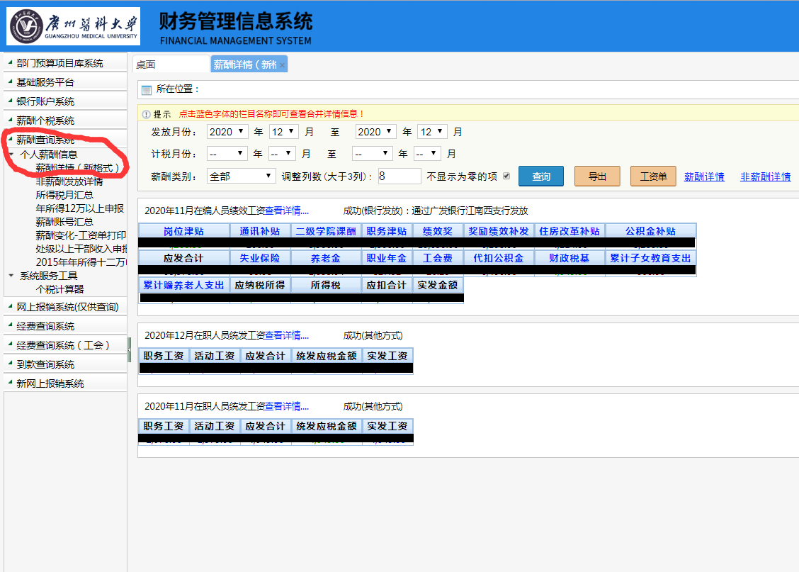 4、进行“财务管理信息系统”,在左侧菜单栏选择“薪酬查询系统”,在“个人薪酬信息”的“薪酬详情”中,选择需要查询月份进行查询。