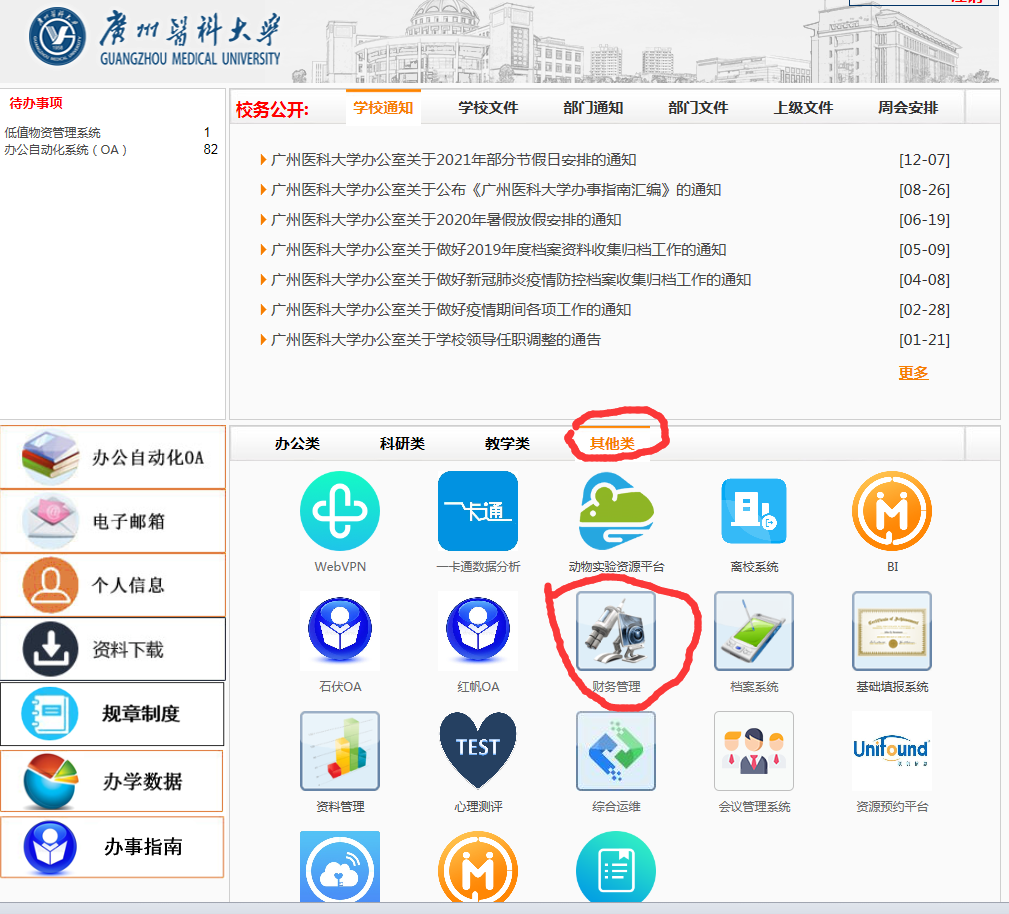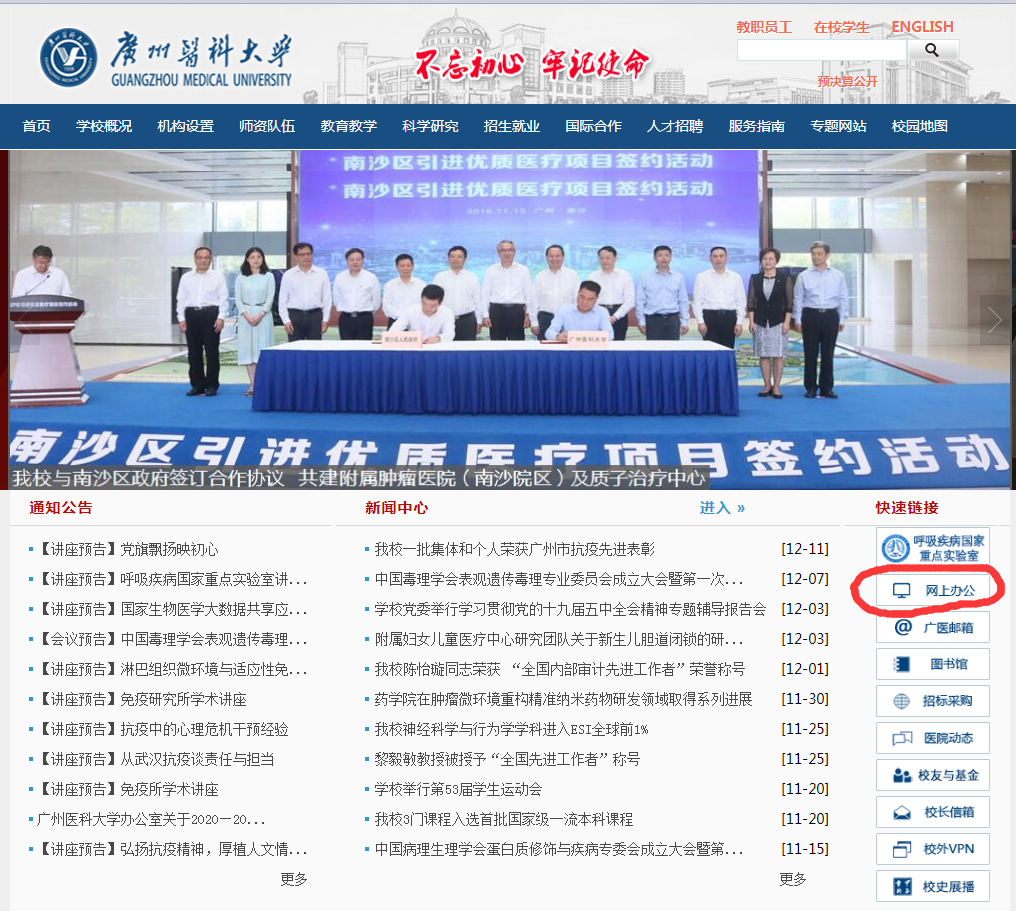 1、打开学校主页(www.gzhmu.edu.cn),点击“网上办公”。