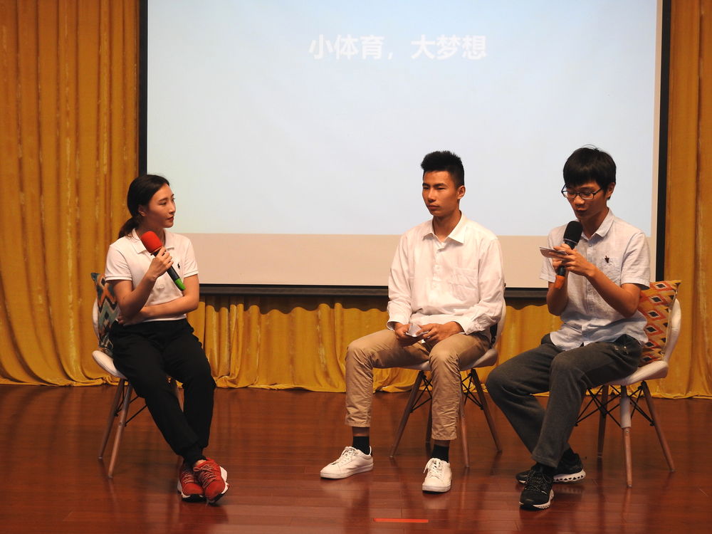 随后,主持人通过访谈的形式与蔡琪子进行了互动。在访谈中,蔡琪子讲述了自己在训练过程中遇到的瓶颈期,也谈到了自身投入青少年体育公益的初心;她的回答使我们看到一名体育竞技者竞技之路的血与泪,也充分体现出了她对体育运动的热爱,对传播体育精神的责任感。在与主持人的互动环节结束之后,现场的观众都为蔡琪子的体育精神,竞技精神所感染,并积极举手向蔡琪子提问。面对同学们的提问,蔡琪子也一一做了详细地解答。