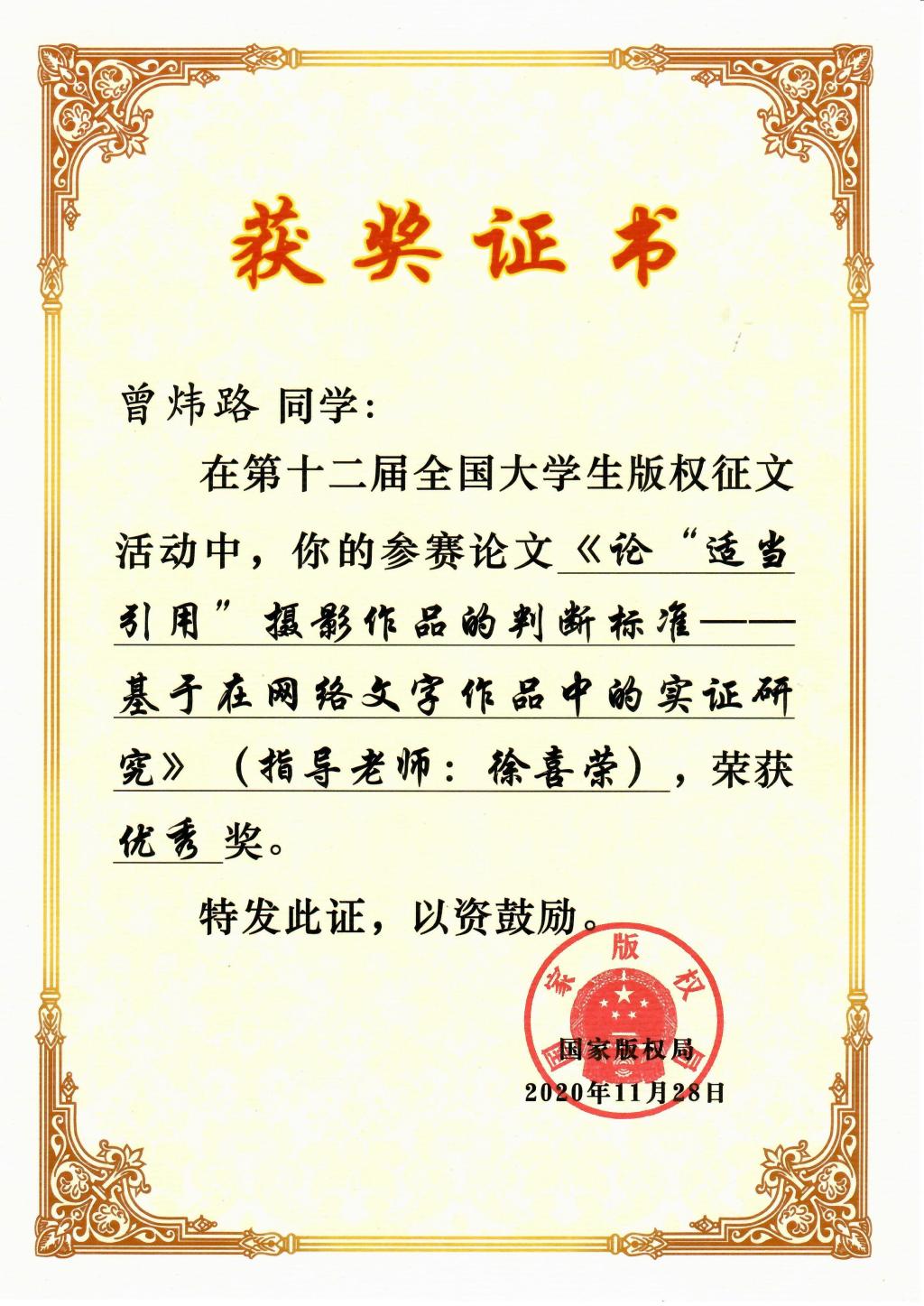 法学系在第十二届全国大学生版权征文比赛中获3项奖励