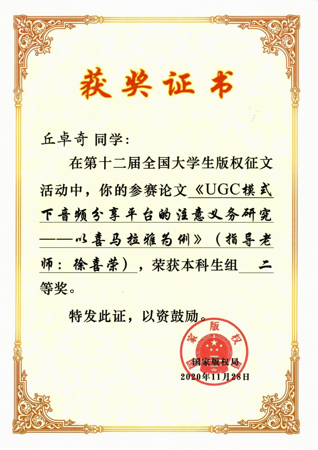 根据公布的比赛结果,2017级法学本科生丘卓奇同学的论文《UGC模式下音频分享平台的注意义务研究--以喜马拉雅为例》获得二等奖,2017级法学本科生曾炜路同学的论文《论“适当引用”摄影作品的判断标准--基于在网络文字作品中的实证研究》获得优秀奖。