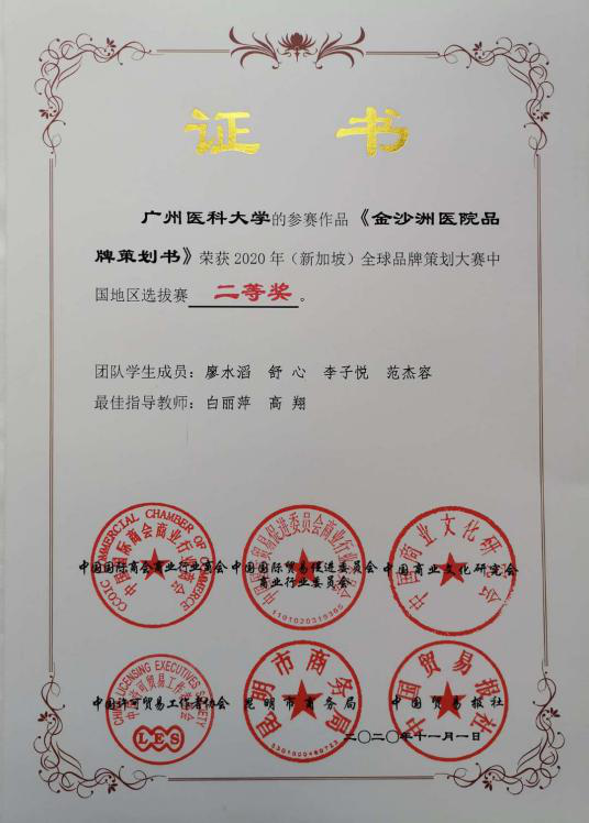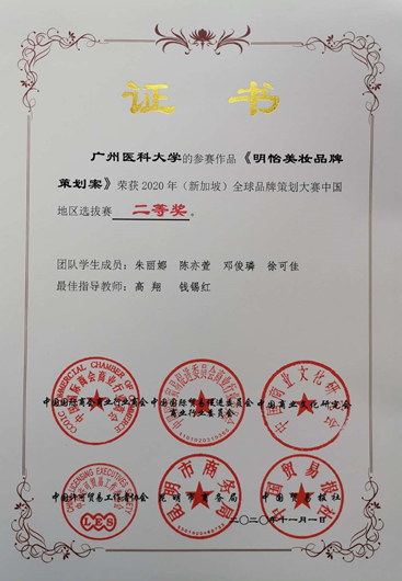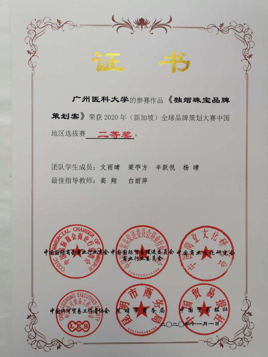 beat365参赛队伍克服疫情影响,以视频在线方式参赛。在老师们的精心指导下,参赛四支队伍(金沙洲医院品牌策划工作室、明怡美妆品牌工作室、独熠珠宝品牌工作室、匡易品牌工作室)在竞争激烈的全国总决赛中凭借优异表现最终斩获大赛中国地区选拔赛四个二等奖!