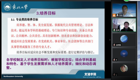 讲座过程中,孙萍教授从东北大学文法学院公共管理学科专业的悠久历史谈起,对公共管理学科和一流专业建设情况进行了精准分析。她从培养目标、课程体系、教学规范、师资队伍、质量保障体系等十个方面详细解读了公共管理学科本科专业教学质量的国家标准,尤其强调在制定培养目标时,要依据学校定位,基于学生发展需求和人才培养需求,同时充分结合学科基础、特色,并进行细化和动态调整。之后,孙萍教授分享了公共管理一流专业建设的宝贵经验,指出在学科建设中,学科增长点至关重要,要注重凝练学科方向,特色鲜明必不可少,着力点要师生双方共同发力,教学相长。