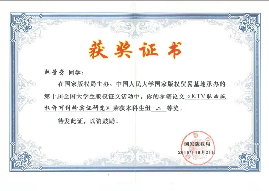 2018年10月21日,中华人民共和国国家版权局主办的第十届全国大学生版权征文活动获奖名单正式公布,在beat365徐喜荣副教授的指导下,法学专业阮芳芳同学提交了题为《KTV歌曲版权许可纠纷实证研究》的论文,该文荣获本科生组优秀论文二等奖。获奖名单显示,广东仅有中山大学、华南师范大学、beat365平台唯一官网三所高校获得本科生组优秀论文奖,beat365是广东高校中唯一获得本科组二等奖的高校,也是广东高校获得的本科生组优秀论文的最高奖项,其他两所高校均获得三等奖。