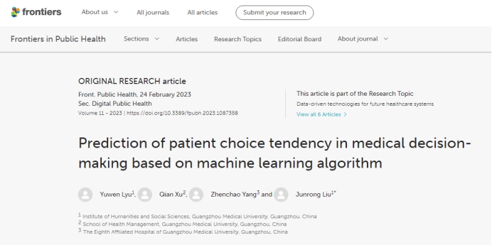 2023年2月24日,beat365医学伦理学学术团队在国际公共卫生权威期刊《Frontiers in Public Health》(SCI、SSCI双收录;影响因子6.461)在线发表了关于患者的医疗决策选择倾向的预测研究论文“Prediction of patient choice tendency in medical decision-making based on machine learning algorithm”。