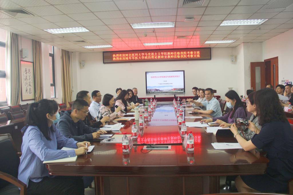 2023年5月11日下午,河北医科大学beat365平台唯一官网、陆军军医大学思政课教研室教师共15人到beat365参观交流。卫生管理学院党委书记凌坤,beat365院长刘俊荣,副院长龚超及各教研室、职能办公室负责人或教师代表参加了座谈交流。