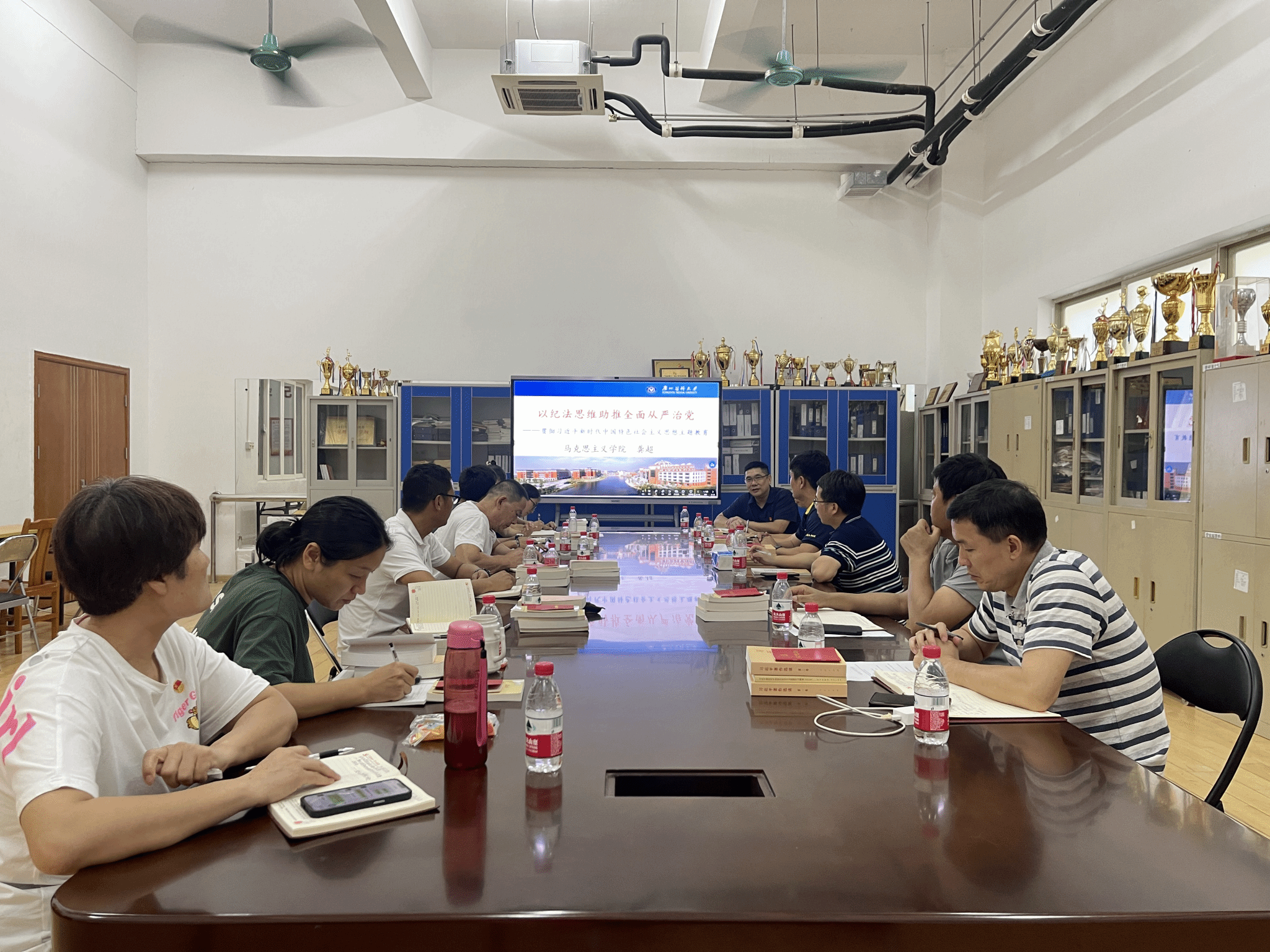 上午,龚超书记来到番禺校区体育馆二楼的体育部会议室,与体育部党支部的全体党员见面。他以“纪法思维助推全面从严治党——学习贯彻习近平新时代中国特色社会主义思想主题教育”为主题,给体育部全体党员讲了一场生动的党课。