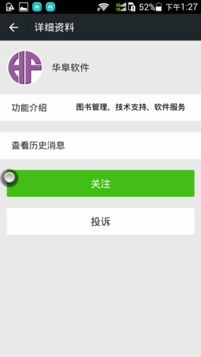 (1)关注华阜软件。在微信APP中点击“扫一扫”,对准下面的二维码,系统扫描成功后,会弹出界面,点击“关注”按钮即可。